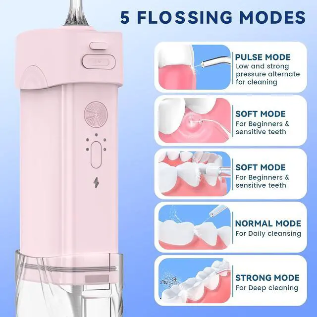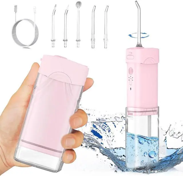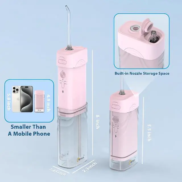 This rechargeable portable water flosser features a 200ml telescopic water tank and five adjustable jet tips, offering customizable pressure modes suited for sensitive gums, orthodontics, and daily oral hygiene. The 360° swivel nozzle reaches hard-to-access areas while a built-in tip carousel keeps accessories neat and germ-free. Rated IPX7 waterproof, its safe for shower use or rinsing under water. Small, USB-powered, and cordless, its perfect for both travel and at-home use. The sleek pink ABS design is not only visually appealing but also durable and compact, ideal for modern lifestyles.