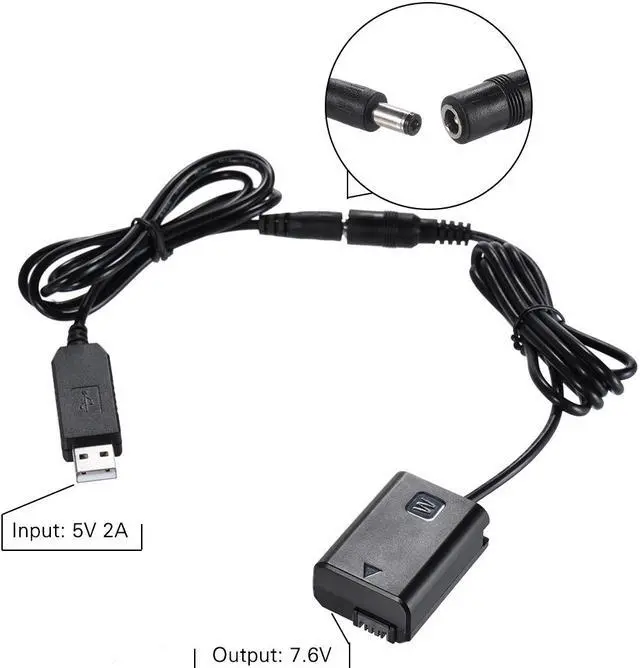 Features: USB port, plug and play, very convenient. Need 5V 2A power bank, mobile power or charging plug (not included) for power supply, largely prolong the shooting time of your camera. Suitable for Sony ILDC cameras, such as for Sony NEX-3/5/6/7 series, A33, A37, A35, A55, a7, a7R, a7II, A6000, A6300, etc. Adopts multi-protection technology, such as short circuit protection, over-voltage protection and over-current protection, which ensures the absolute safety during use. Cable length is up to 1.5 m. Long enough, very convenient to put your own power bank or mobile power in your pocket or bag, or at somewhere else.