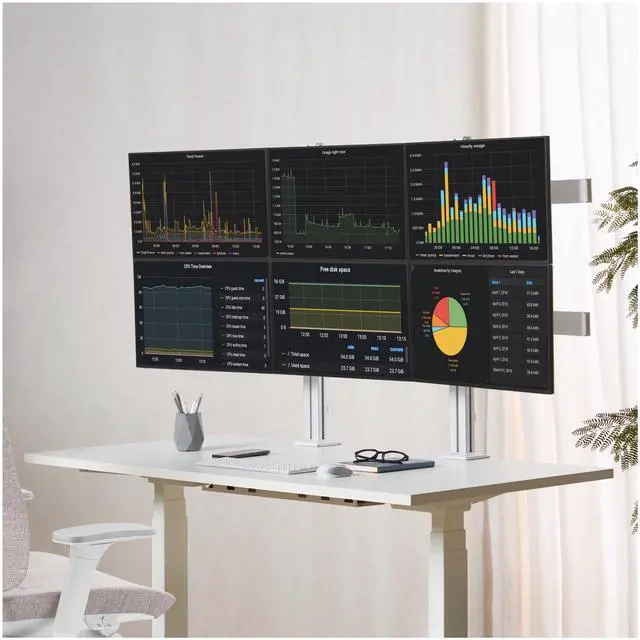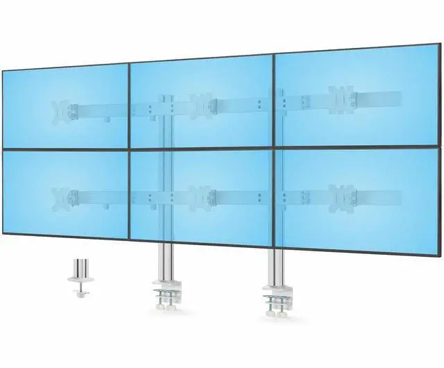 Six-Monitor Desk Mount with Crossbar, Up To 32-inch Computer Screens, Max 17.6 lb (8kg) each, Dual Column, C-clamp/Grommet, Height Adjustable - VESA compatible 75x75/100x100 6-MONITOR-ARM-A