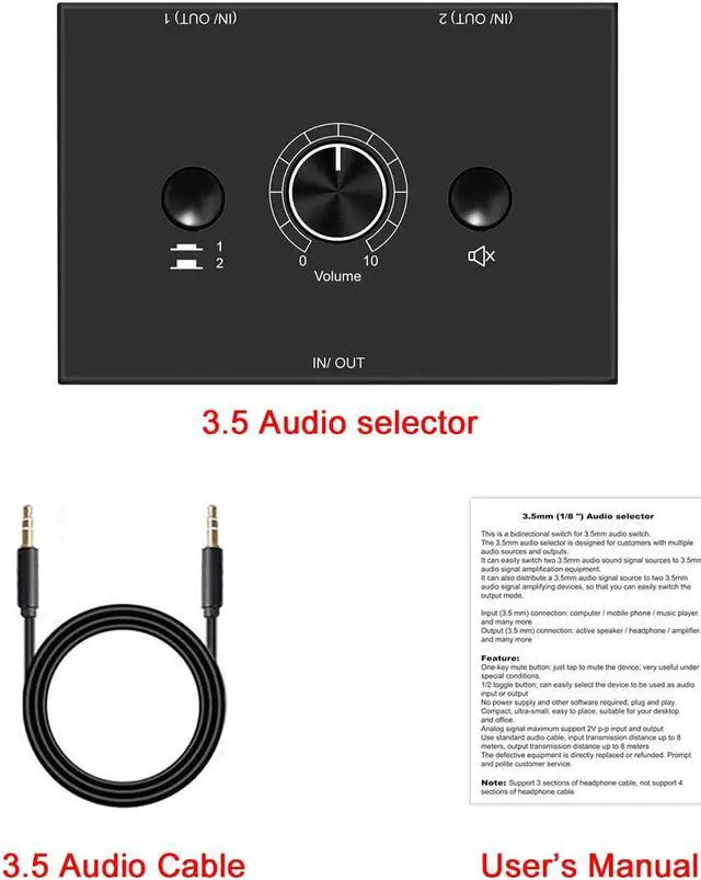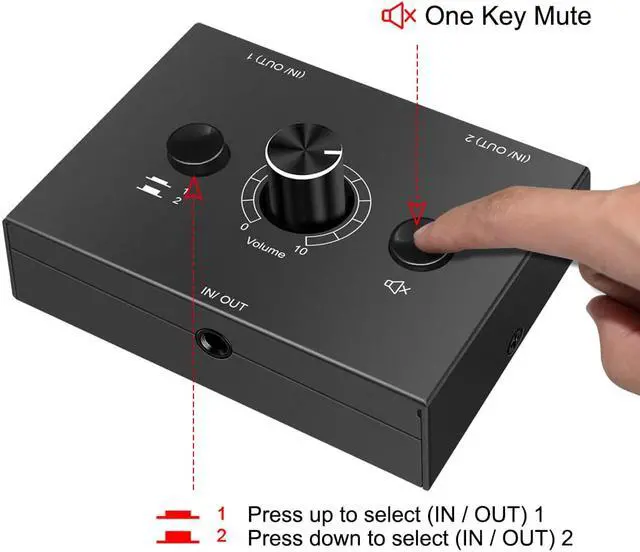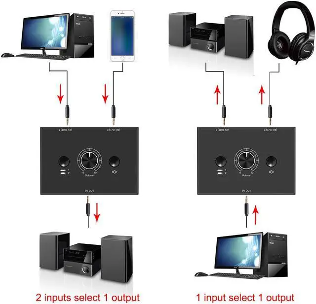 1: Easily connect two audio signals to one speaker at the same time, and then switch one output. (Note: not two simultaneous outputs)