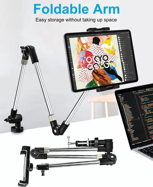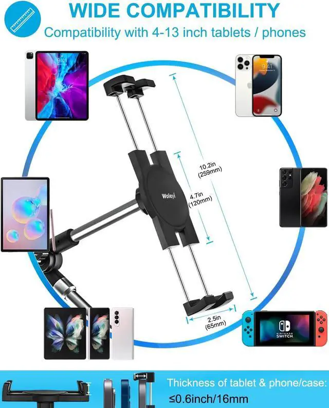 Broad compatibilityThis universal metal long arm tablet stand, the adjustable side clamps extend from 4.7 in to 10.2 in, compatible with all 4 - 13 inch smartphones and tablets, such as new iPad Pro 9.7 / 10.5 / 11 / 12.9, iPad Air 2, Air 3, Air 4, iPad Mini 1/ 2 / 3 / 4 / 5, iPhone 12, 12 mini, 12 Pro, 12 Pro max, 8, 8 Plus, X, XS, XR, XS Max, 11, 11 Pro / 11 Pro Max, Galaxy Tab/ Galaxy Note/ Galaxy S and more cell phones or tablets.