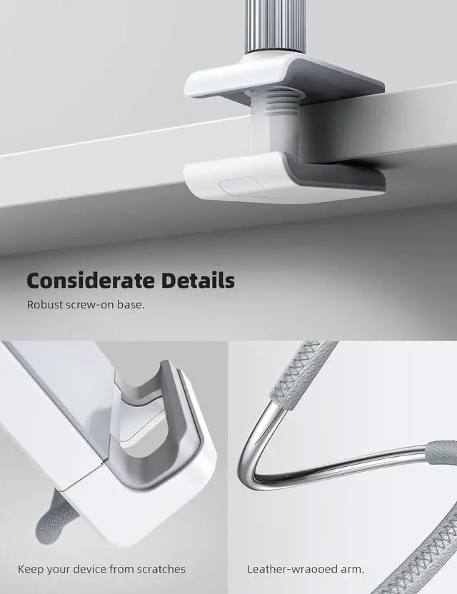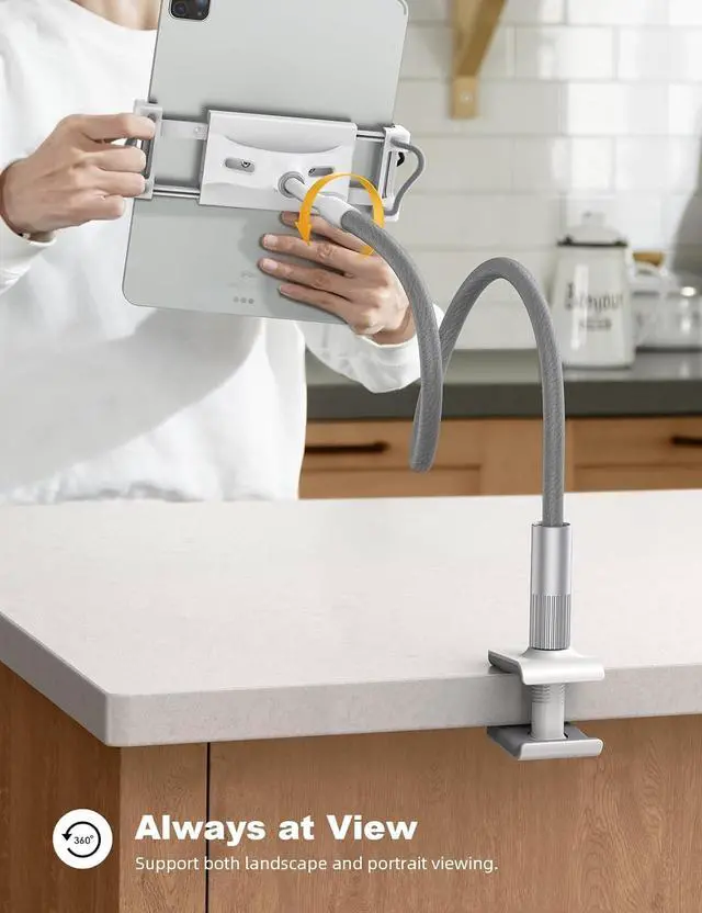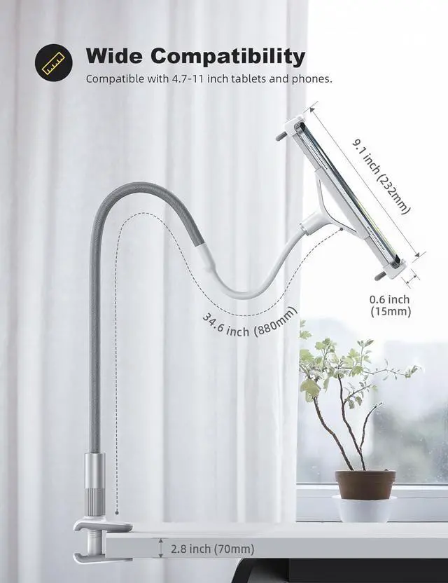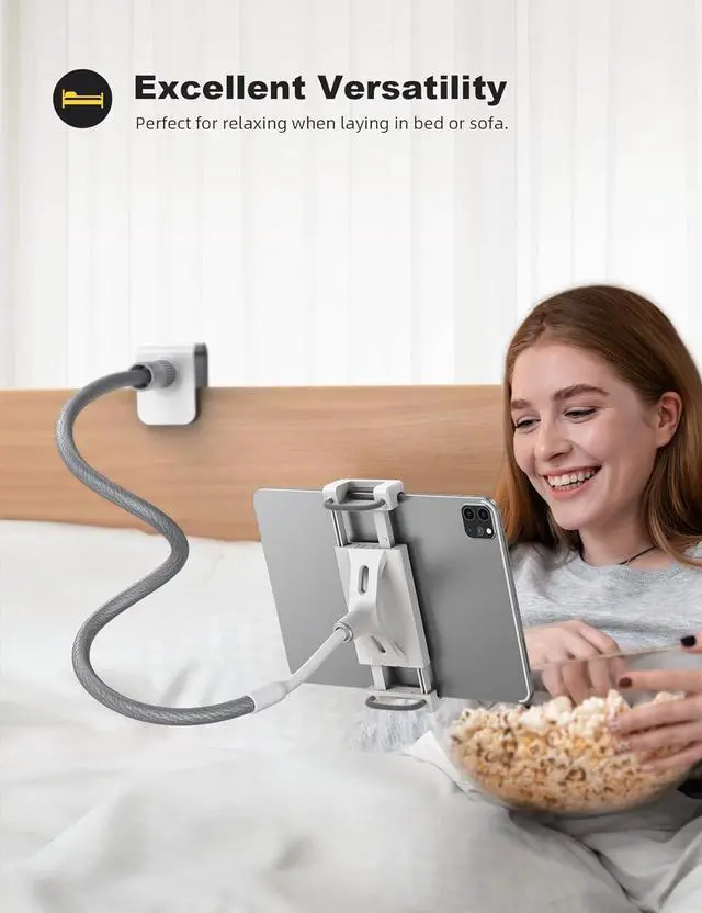 Broad compatibilitythis ergonomic gooseneck tablet holder, compatible with all 4.7 - 10.5 inch cell Phones and tablets, such as 2022 iPad Pro 11, 10.9, ipad 10th generation, iPad Air 5 4 3, iPad mini 2 3 4 5 6, iPad Pro 9.7, 10.5, 2021 iPad Pro 11, iPhone 15 Pro Max, iPhone 14 Pro Max, iPhone 13 Pro Max, iPhone 12 Pro Max, iPhone 11 Pro Max, Galaxy Tab A8 A7, Galaxy Tab S8 S7, Galaxy Tab E, Switch, Kindle.
