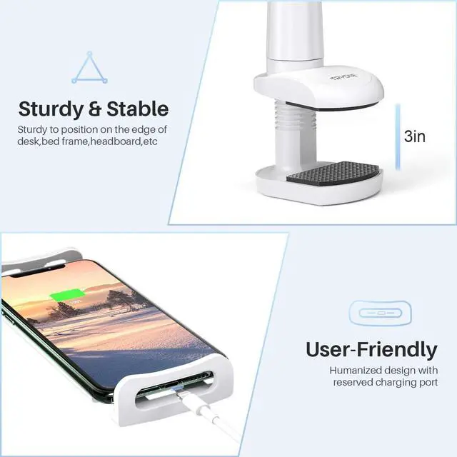 Using Tips1. When holding a heavy tablet larger than 8 inch, loop the gooseneck into a circle shape or bend it into S shape which could provide some more stability. 2. Bend using two hands and bend just the gooseneck when adjusting the position because it is stiff. Pull the device violently to adjust may broke the nut. 3. Also, don't overtighten the base clamp too much so it won't break easily.