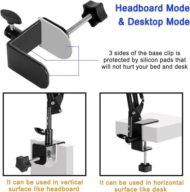 Adjustable & Versatile The tablet arm stand has three-stage long arm and 4 joints, which is fully adjustable and 360-degree rotatable. It can be used in vertical surface like headboard or used in horizontal surface like desk. Bend the arm and turn the holder to the most comfortable viewing position whether you are standing, sitting or lying in bed.