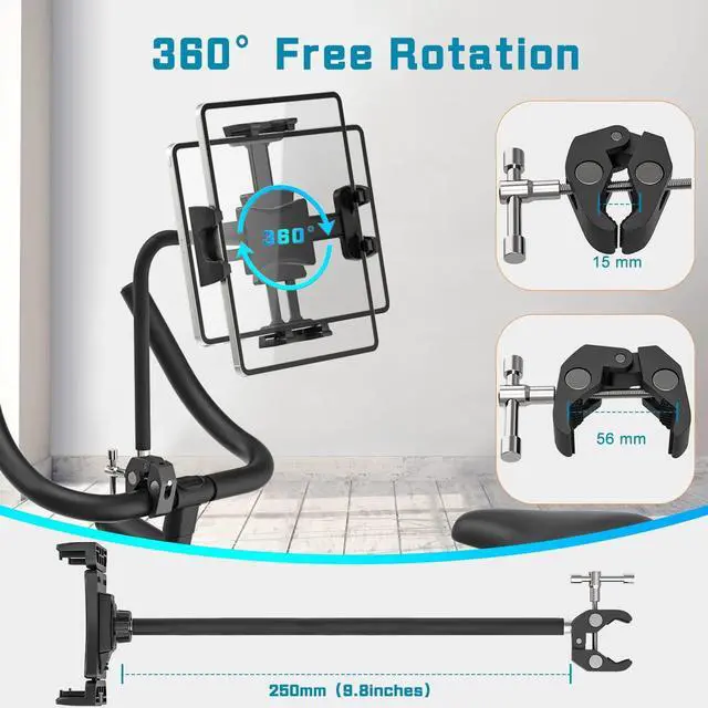 Multi-Angle Rotatable Crosstrainer Tablet Holder: This spinning bike tablet holder comes with a swivel ball head, which allows the tablet exercise bike mount can be rotated 360°. The length of the flexible arm is 9.8 in, which can keep the tablet at an appropriate distance from your eyes. Can align the tablet in portrait and landscape orientation and tilt it up or down to provide the best viewing angle. Perfect for following your sports channel on your tablet while you training on the treadmill.