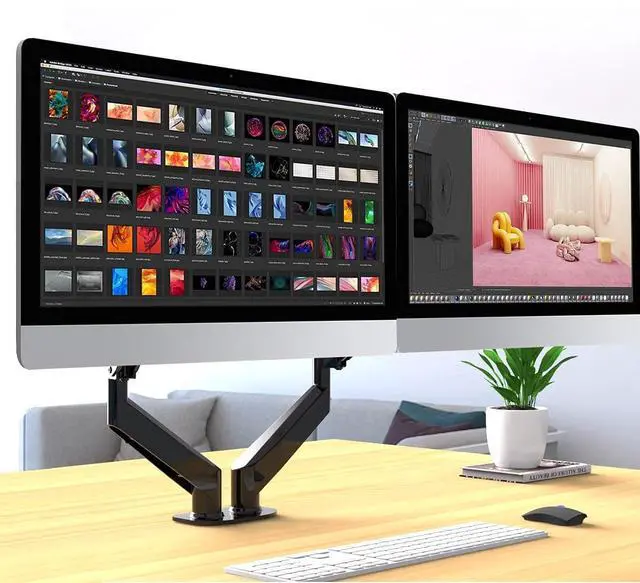 Featuring aerospace-grade aluminum alloy and high-quality gas springs, the dual monitor stand provides rock-solid stability for up to 22 lbs on each arm. The strong construction keeps both of your large screens steady without unwanted wobble or sagging.