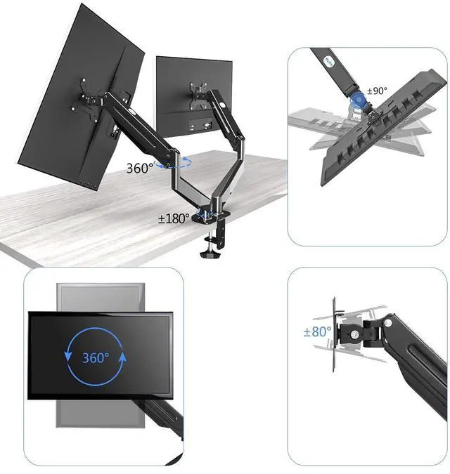 Our dual monitor stand offers full motion adjustment with +/-90° swivel, +85°/-80° tilt, and 360° rotation. Easily find the optimal viewing angle for both of your screens, enhancing productivity and comfort for gaming, entertainment, and essential work tasks.