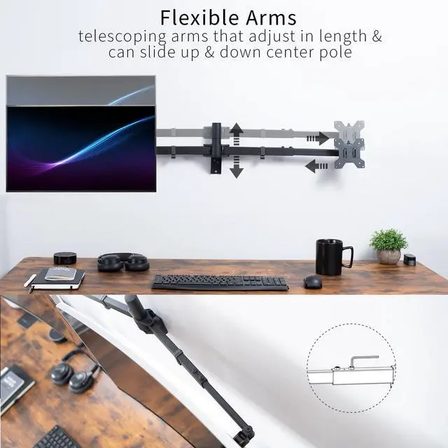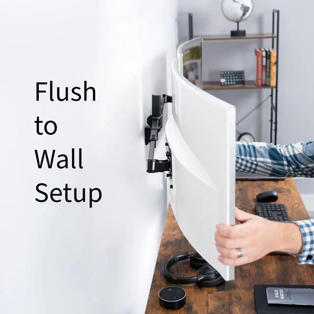 Premium telescoping arms adjust in length to fit your monitors, accommodating 27” to 38” screens with ease. The adaptable nature allows a snug side-by-side monitor positioning that’s flush with the wall for a clean appearance.