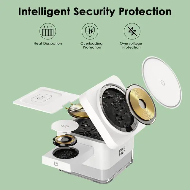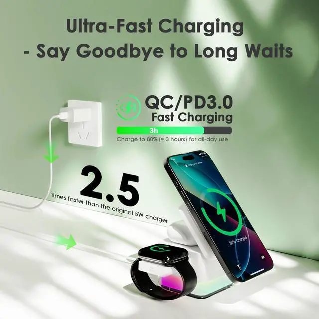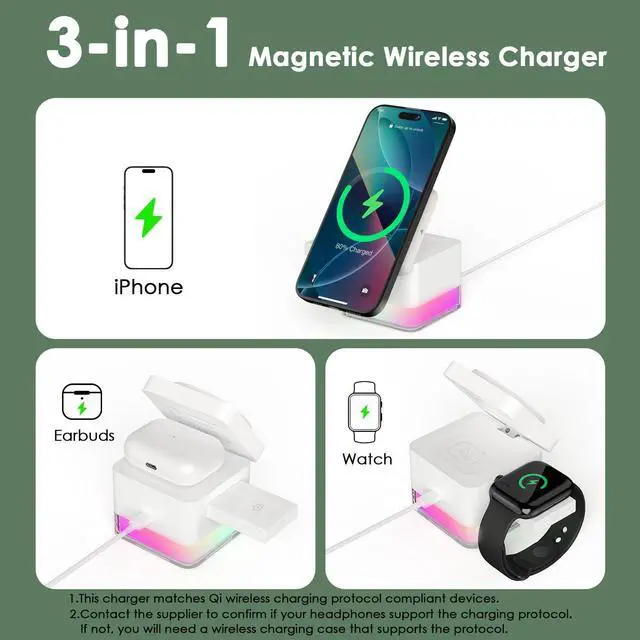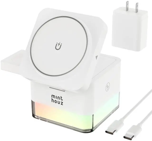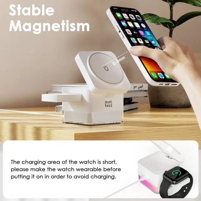 Minthouz 3 in 1 Apple Charging Station: Wireless Charger iPhone Magnetic Charger with Multi-Color Light for Multiple Devices Cutting-Edge Technology for Lightning-Fast Charging: Unleash the power of cutting-edge technology with our 3-in-1 wireless charging station, engineered to transform the way you charge your devices. Officially certified by Qi and equipped with the latest technology, this charger delivers lightning-fast 15W wireless charging for iPhones. Watch in amazement as your iPhone, achieving a full charge in a mere 2 hours and 15 minutes - faster than traditional chargers. Foldable Design for Ultimate Portability and Convenience: Experience the epitome of portability with our compact, foldable design.It's impressively smaller than other models, making it the ultimate solution for travelers seeking a lightweight and space-saving charging option. Advanced Magnetic Alignment for Secure Charging: Powered by advanced magnetic modules, our charger provides unrivaled magnetic alignment, ensuring your device stays securely in place during charging. With compatibility for phone cases under 5mm thickness, consider pairing it with a MagSafe case for an optimal user experience. Universal Compatibility for Seamless Charging: Experience the ultimate convenience with our adaptable 3-in-1 charging stand, compatible with a wide range of Apple devices such as iPhone models, Apple Watch, AirPods, and beyond. Harnessing the power of MagSafe technology, this stand guarantees efficient charging for your devices, delivering unparalleled convenience and top-notch performance. Specifications: Material: ABS&PC Plastic Transmission Distance:2-5mm Weight218g Product Dimensions:6.8*6.8*6.7cm2.7*2.7*2.6in USB-CInput:5V--3A9V-2A12V--1.5A Phone: 5W/7.5W/10W/15W Earbuds:3W Watch:2.5W(Max) Note: 1. Operate the product within 0°C to 40°C ambient temperature range. 2. Avoid inserting metal objects between the wireless charging panel and the mobile phone during charging. 3. During charging, the magnetic wireless charger may generate heat; it is within normal limits if its temperature reaches up to 60°C. 4. Keep the product away from magnetic cards, bank cards, and chip-containing documents to prevent damage. Also, avoid placing it near magnetic recording equipment or precision instruments. 5. This non-waterproof product should be kept away from liquids. Additionally, ensure it is out of reach of children under 14 years old and maintain cleanliness for longevity. In The Box 1x 3-in-1 Magnetic Wireless Charger 1x Type-C Cable 1x USB-C 20W Power Adapter 1x Quick Start Guide