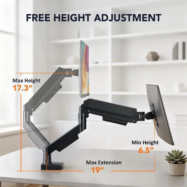 With precision-engineered adjustability, you can tilt +90° to -45°, swivel 180°, rotate 360°, and extend your monitors effortlessly, ensuring your screen is always at the perfect height, angle, and distance.