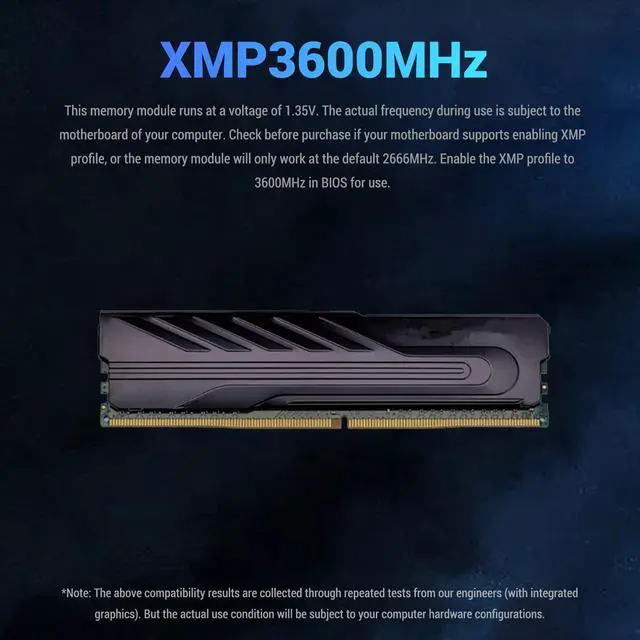 Note: If you choose (16GB 3600 XMP Intel), the actual frequency during use will be subject to the motherboard of your computer. Enable the XMP profile to 3600MHz in Bios or it will be running at the default 3200MHz. To successfully enable XMP profile, make sure firstthat your CPU supports memory overclocking and then enter BIOS to enable the XMP profile through one click.