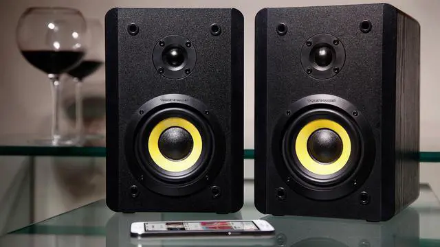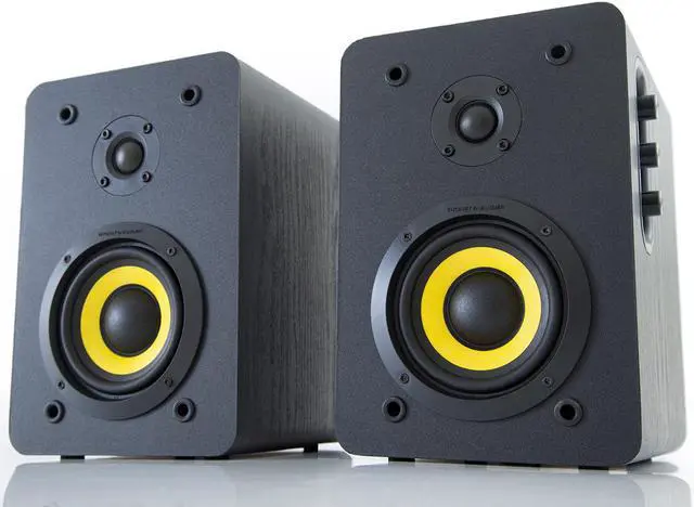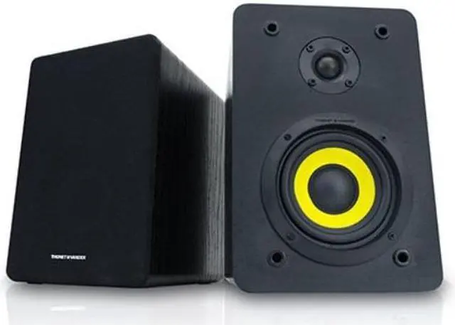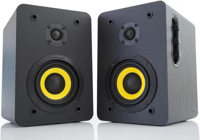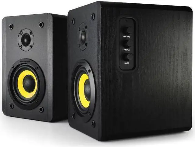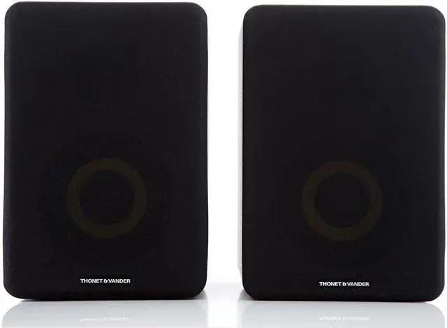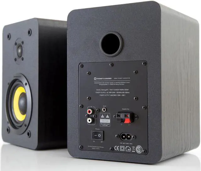 Meet Vertrag, Thonet and Vander's 2.0 compact bookshelf studio monitors with Bluetooth 4.0. Compact shape, wide sound engineering and design at the service of your senses, so you can perceive sounds with enhanced intensity and power. The Vertrag Bluetooth bookshelf speakers offer a new way of listening to music, where its technological and acoustic innovations enables you to perceive every detail of your favorite music. Live an unlimited sound experience. Vertrag Bluetooth near-field studio monitors has a power output of 36 watts RMS. These Bluetooth Hi-Fi active 2.0 near-field studio monitors can be appreciated due to its geometric design where the fine details in the lateral angles adds a fresh and dynamic note. Medium sized, exactly 161 x 190 x 240 mm, it has the ability to provide class and elegance to every room of your house. The Vertrag Studio Monitors delivers a high quality sound, with a high response and performance. It has the ability to harmonize perfectly the extreme treble and bass frequencies, allowing a pure playback of music.Essential for those who seek high performance equipment in the home audio system range. Hammer Bass technology allows playing the bass sounds in a deeper and adjusted way. It enables to magnify the impact of bass frequencies, dynamic and deeply perceived, even when playing at high volume. You can experience the sound like in a real theater in your home or office. Each speaker in these active 2.0 near-field studio monitors has a 4-inch woofer made of lignin cane fiber*. This natural polymer is ultra-durable and lightweight, allowing the driver to optimize performance. The tweeter is 0.5 inches, made entirely of polyethylene micro sheets, which provide precision and detail on treble. Ergonomic controls are built with materials of the latest generation, which allows to optimize the selection range by regulating in a precise and detailed way the volume, bass and treble. Key components manufactured in Germany and assembled in PRC. With Vertrag BT, enjoying your favorite music in HD has never been easier. Thanks to its Bluetooth connectivity, this compact HiFi 2.0 system allows filling any room with the most pure sound. Given its modern design and simple lines, it's the perfect allied for any space. Contains: 2 Bluetooth bookshelf speakers