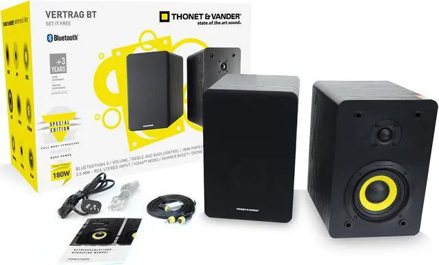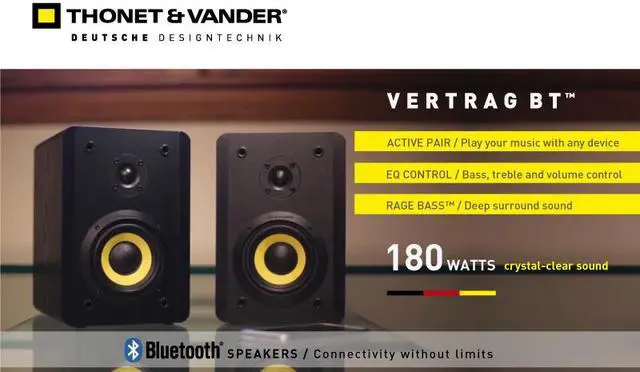 ompact shape, wide sound engineering and design at the service of your senses, so you can perceive sounds with enhanced intensity and power. The Vertrag Bluetooth speakers offer a new way of listening to music, where its technological and acoustic innovations enables you to perceive every detail of your favorite music. Vertrag Bluetooth has a power output of 180 watts Peak Power. These speakers can be appreciated due to its geometric design where the fine details in the lateral angles adds a fresh and dynamic note. Medium sized, it has the ability to provide class and elegance to every room of your house. The Vertrag Bluetooth delivers a high quality sound, with a high response and performance. It has the ability to harmonize perfectly the extreme treble and bass frequencies, allowing a pure playback of music. This speaker system is essential for those who seek high performance equipment in the home audio system range. Hammer Bass™ technology allows playing the bass sounds in a deeper and adjusted way. It enables to magnify the impact of bass frequencies, dynamic and deeply perceived, even when playing at high volume. You can experience the sound like in a real theater. Each speaker has a 4-inch woofer made of lignin cane fiber*. This natural polymer is ultra-durable and lightweight, allowing the driver to optimize performance. The tweeter is 0.5 inches, made entirely of polyethylene micro sheets, which provide precision and detail on treble. Ergonomic controls are built with materials of the latest generation, which allows the ability to optimize the selection range by regulating in a precise and detailed way the volume, bass and treble