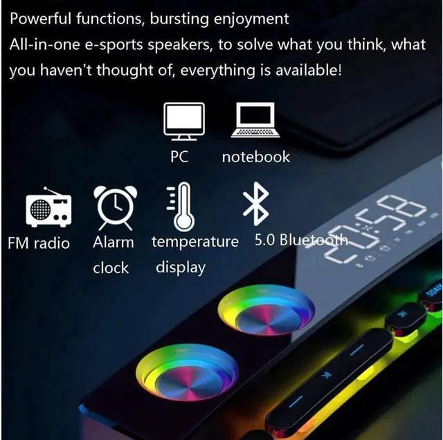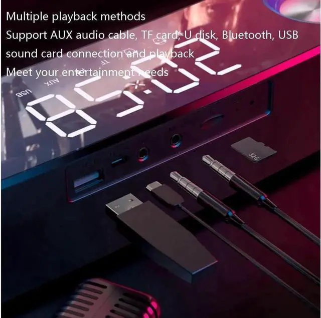 Other functions: Bluetooth, FM, clock alarm, U disk Package Included 1*speaker 1*charging cable 1*audio cable 1*instruction Notes Due to the difference between different monitors, the pictures may not reflect the actual color of the item. Compare the detail sizes with yours, please allow 1-3cm error, due to manual measurement. If you have any questions about the product, please contact our customer service staff in time