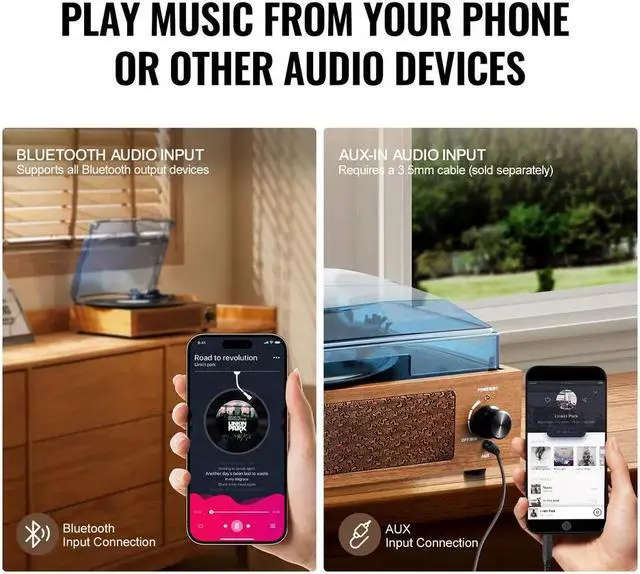 1. Our record player supports 33, 45, and 78 RPM, compatible with 7''/ 10''/12'' (18/25/30 cm) vinyl records. The built-in 3W speaker and easy Bluetooth and Aux connections let you easily stream music from your phone, tablet, or other audio devices. Explore the magic of vinyl music with us!