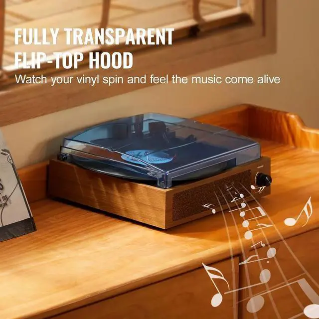 2. Enjoy vinyl music even without additional speaker equipment. The built-in 3W speaker of our Bluetooth vinyl record player delivers solid and warm sound, allowing you to carry it to different rooms or event spaces and enjoy music anytime, anywhere.