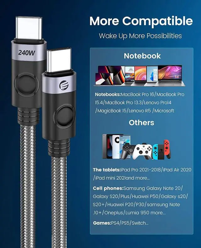 The 240W USB C to USB C cable is ORICO's newest charging technology and is currently the fastest Type C cable. Only a 240W USB C charging cable can meet the needs of fast charging. It is compatible with power below 240W, such as 180W/140W/100W/60W etc.