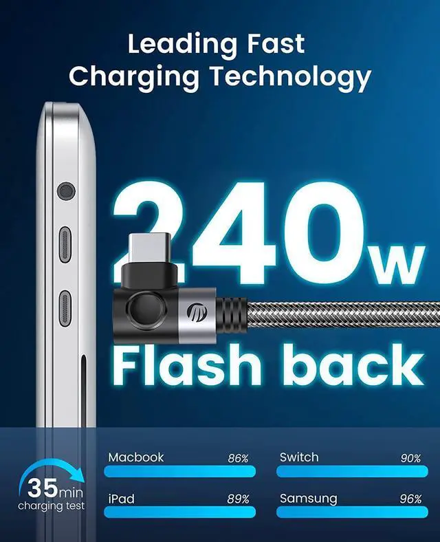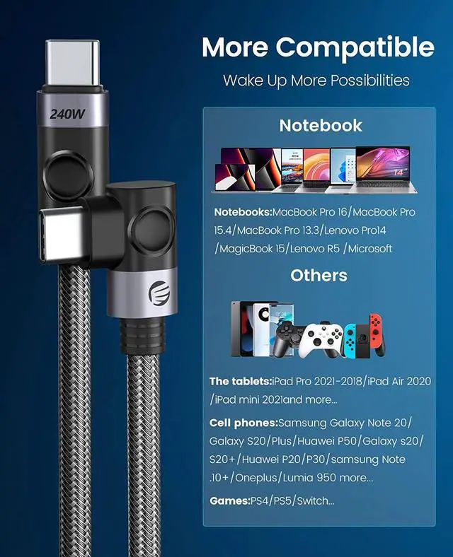 The innovative 90-degree Type-C cable is as ergonomic as an elbow, making it easier to plug or unplug the cable. Over 40, 000 times bending tests with premium nylon material, plus the upgraded 3D aluminum alloy connector technology ensured the metal part won't break and adds the PD 240w Type C to Type C charging cable additional durability and tangle-free.