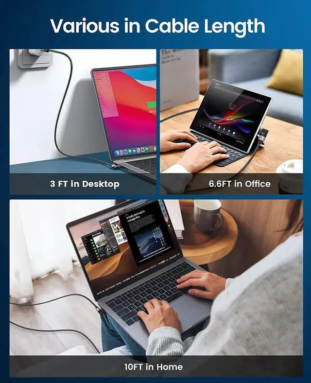 USB C cables are available in a variety of lengths (3ft, 5ft, 6.6 ft, 10ft) to meet various charging environments. Backward compatibility can serve all USB C devices such as laptops, tablets, mobile phones, Smart watches, headphones, etc. No need to buy additional fast charging cables for phones and laptops separately.