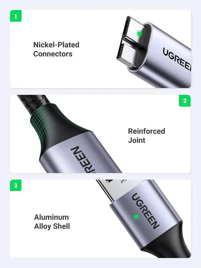 UGREEN Micro USB 3.0 Cable, USB 3.0 A to Micro B Cord Nylon Braided External Hard Drive Cable Compatible with Samsung Galaxy S5, Note 3/Pro 12.2, Western Digital, Toshiba, My Passport, etc 1.5 FT