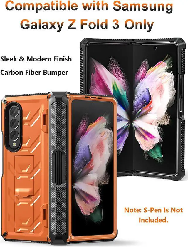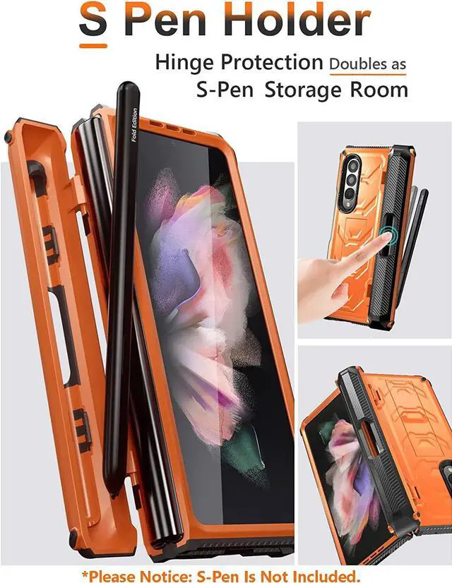 Hinge Protection Also for S Pen Store Room: Innovative 2-in-1 design for all-inclusive hinge protection seamlessly doubles as the S Pen holder, you can take your Pen anywhere anytime with our z fold 3 cases. NOTICE: S-Pen Is Not Included. And unfolding the hinge bumper, you will hear a weak “clip-crack” sound. Repeat "fold, unfold" is some kind of stress relieving.