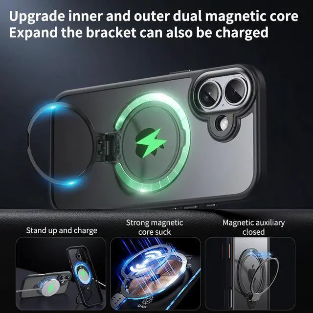 [Exclusive Dual Inner & Outer Magnets] The case is embedded with 2 magnets, outer magnetic stand and inner magnetic ring, which ensures the consistent wireless charging and magnetic connection no matter you open or close the stand. When it opens, you can snap the charger to charge it at the same time. When it closes, it can strongly attach to those magsafe accessories such as magnetic leather wallet and sleeve, stand wireless charger, credit cards, etc.