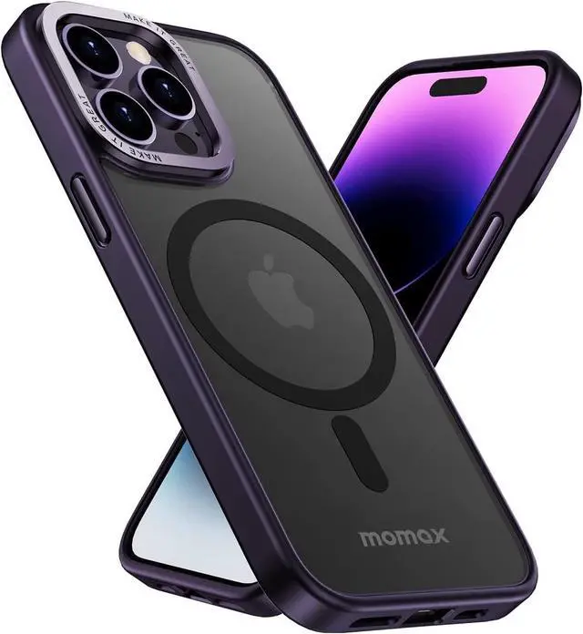[Worry-free Protection]: MOMAX iPhone 14 Pro Max case with magnet comes with a flexible shockproof TPU frame and 4 corner dispersion airbags to effectively protect your phone from drops, collisions and face-up or face-down injuries. The unique metal camera frame is not only a stylish decoration, but also a sturdy protection for your lens against daily bumps.