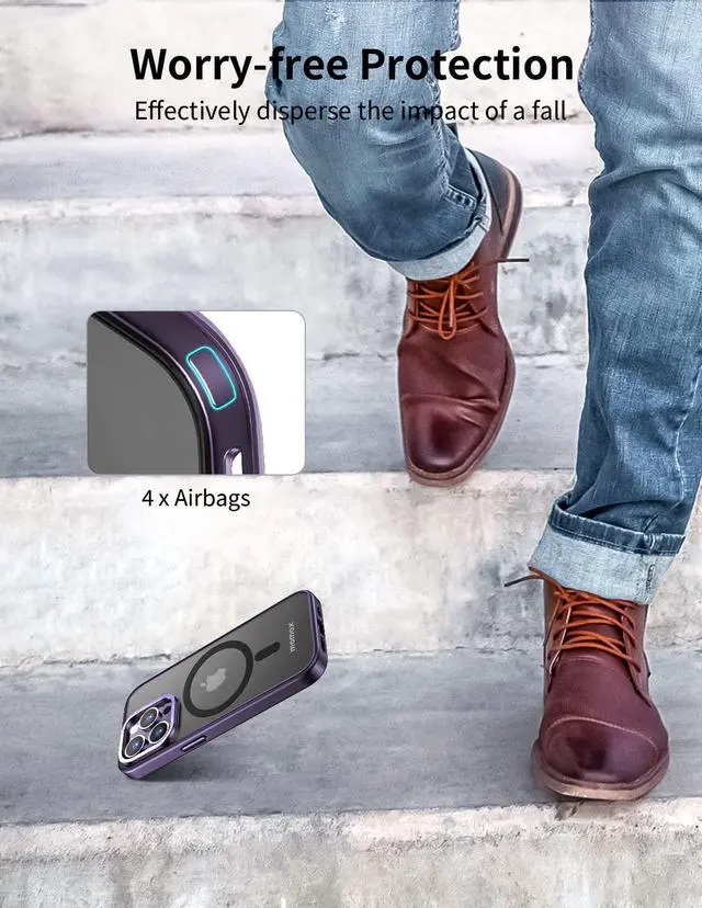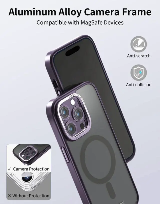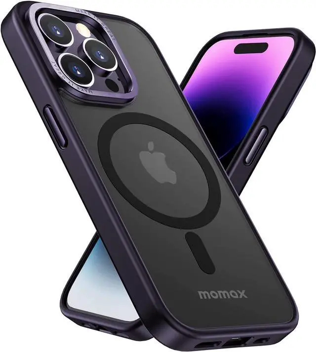 [Worry-free Protection]: MOMAX iPhone 14 Pro case with magnet comes with a flexible shockproof TPU frame and 4 corner dispersion airbags to effectively protect your phone from drops, collisions and face-up or face-down injuries. The unique metal camera frame is not only a stylish decoration, but also a sturdy protection for your lens against daily bumps.