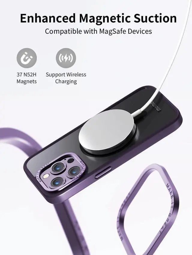[Super Magnetic Power]: With built-in 37 super N52H magnets, this MagSafe case for iPhone 14 Pro enhances the magnetic power of your iPhone attached to the MagSafe accessories. It automatically aligns your MagSafe devices such as chargers, wallets, battery packs and car mounts, and does not interfere with wireless charging.