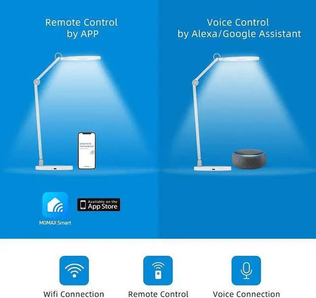 Voice & Remote ControlOur home smart desk lamp supports voice control in combination with Alexa ,Google Assistant, and IFTTT. Connect Wifi and download MOMAX Smart App to control home devices from anywhere.