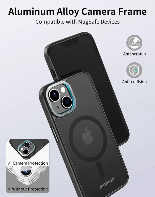 [Worry-free Protection]: MOMAX iPhone 14 Plus case with magnet comes with a flexible shockproof TPU frame and 4 corner dispersion airbags to effectively protect your phone from drops, collisions and face-up or face-down injuries. The unique metal camera frame is not only a stylish decoration, but also a sturdy protection for your lens against daily bumps.