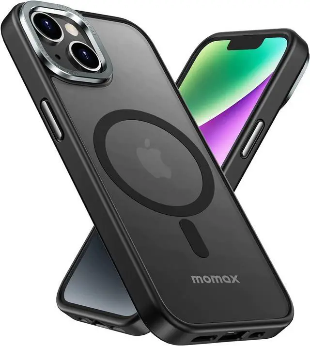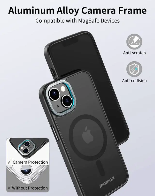 [Worry-free Protection]: MOMAX iPhone 14 case with magnet comes with a flexible shockproof TPU frame and 4 corner dispersion airbags to effectively protect your phone from drops, collisions and face-up or face-down injuries. The unique metal camera frame is not only a stylish decoration, but also a sturdy protection for your lens against daily bumps.