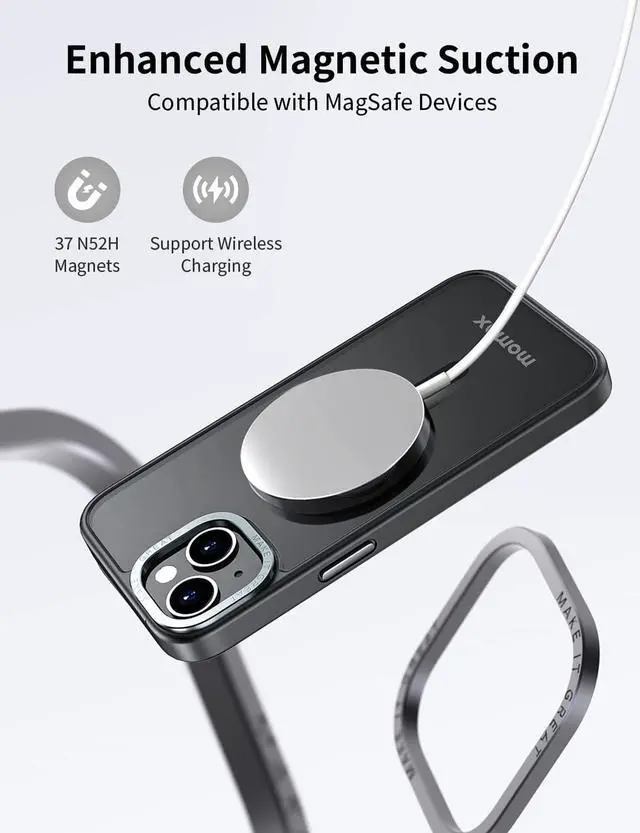 [Super Magnetic Power]: With built-in 37 super N52H magnets, this MagSafe case for iPhone 14 enhances the magnetic power of your iPhone attached to the MagSafe accessories. It automatically aligns your MagSafe devices such as chargers, wallets, battery packs and car mounts, and does not interfere with wireless charging.