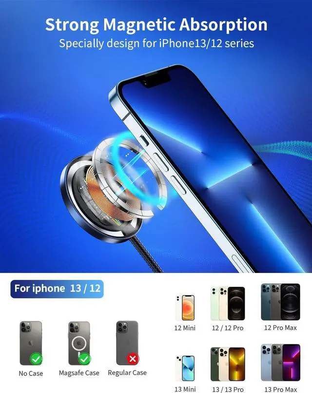 Compatible with iPhone 12/13This transparent magnetic wireless charger provides fast wireless charging for your magsafe devices, specially designed for iPhone 13, iPhone 13 Pro, iPhone 13 Pro Max or iPhone 14, iPhone 14 Max, iPhone 14 Pro, iPhone 14 Pro Max, iPhone 13 mini, iPhone 12, iPhone 12 Pro, iPhone 12 Pro Max or iPhone 12 mini. It also supports wireless charging compatible with AirPods 3, AirPods 2, AirPods Pro, and MagSafe Charger-adapted official case.