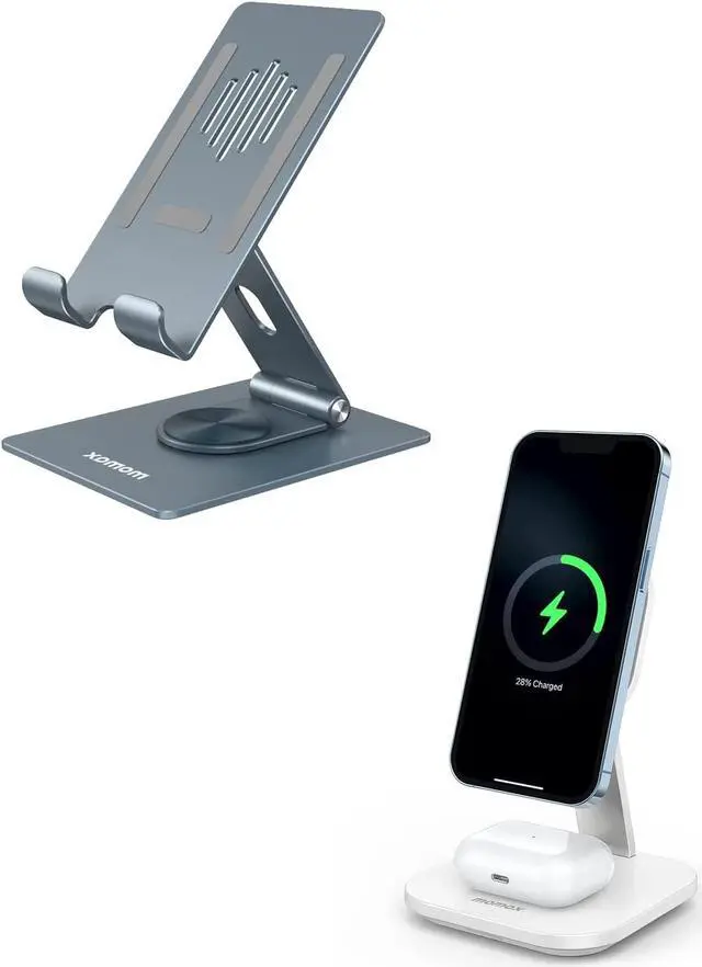 Super Magnetic SuctionThe upgraded magnetic force of the wireless charger stand will hold your phone securely; it won't slip off. Easily lock into any position to provide landscape or portrait view mode. Free your desk from messy charging cables with this 2-in-1 charging station.