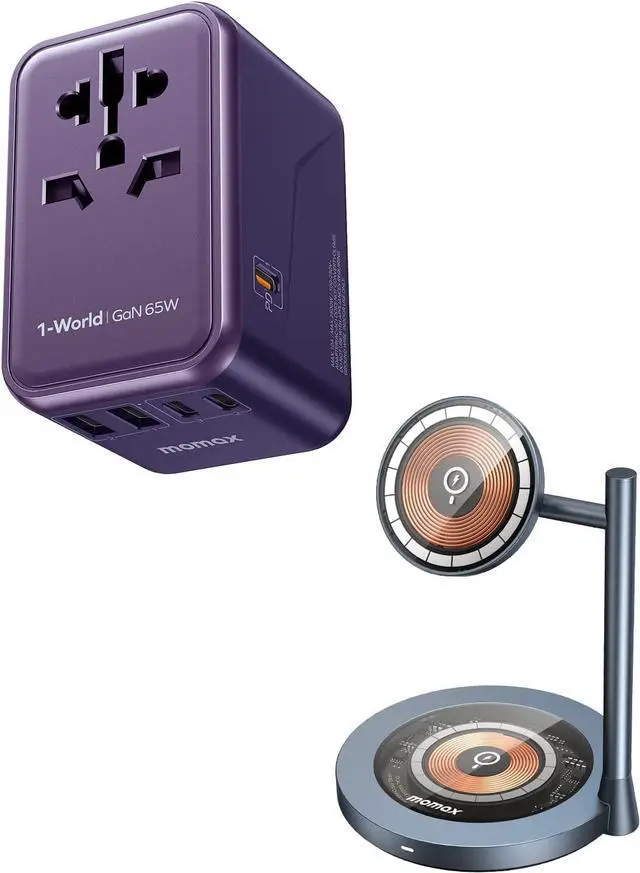 MOMAX Universal Travel Adapter, 65W GaN Travel Plug Adapter with UK/EU/AU/US Plugs, 3USB-C PD & 2USB-A QC, Wireless Charger Stand, Transparent Wireless Magnetic Charger with Magnetic Base