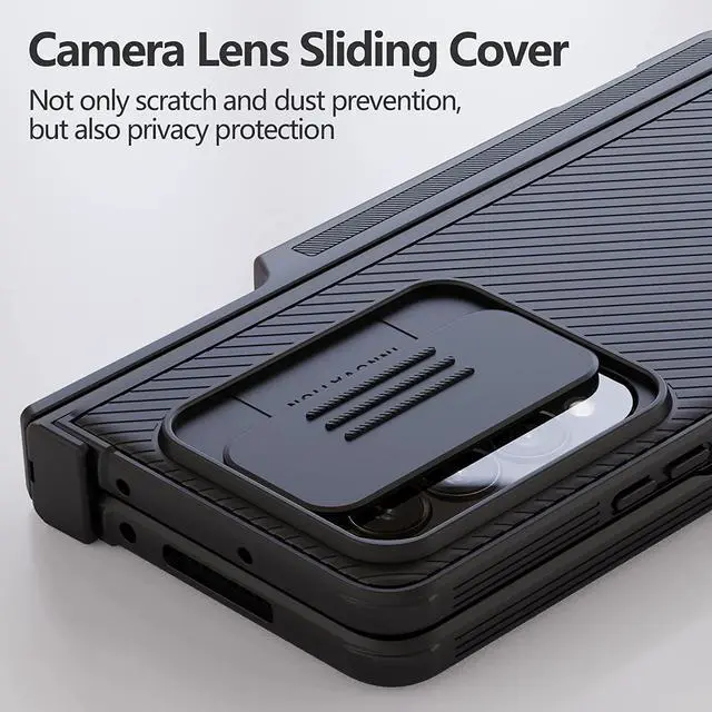 Lens ProtectionNillkin patented (Patent No.:ZL201620435995.9) unique camera slide cover design for protecting the expensive camera perfectly. Preventing from the disclosure of our privacy. No longer needed glass camera protector, save money. Slight lock in each side of the samsung z fold 4 case, doesn't slide randomly.