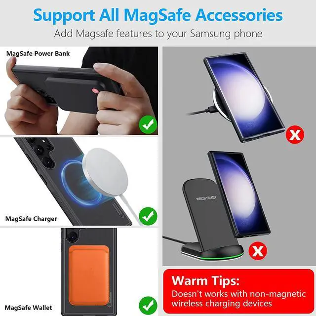 Upgarde Your Samsung PhoneThis galaxy s23 ultra phone case supports MagSafe charger without removing the case. With this case, you can easily access all MagSafe accessories, such as MagSafe car mounts, MagSafe wallet and MagSafe ring holder. Bring convenience to your daily life. mounts, MagSafe wallet and MagSafe ring holder. Bring convenience to your daily life.