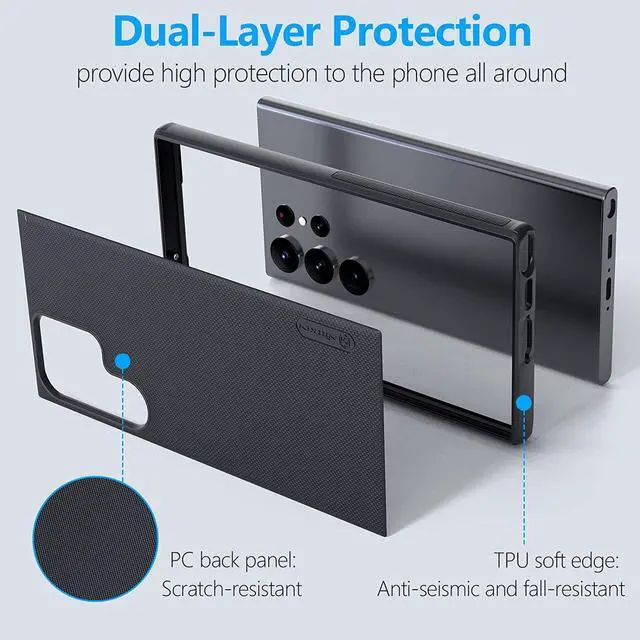Great Grip and Touch FeelingNillkin Super Frosted Shield Series cases with a 3D bump pattern design specially for the galaxy s23 ultra thin case. It adopts advanced dust-free frosted UV oil injection process, which is comfortable to touch, and the overall texture is calm and generous. Wear-resistant and non-slip, dustproof, anti-fingerprint, easy to clean.