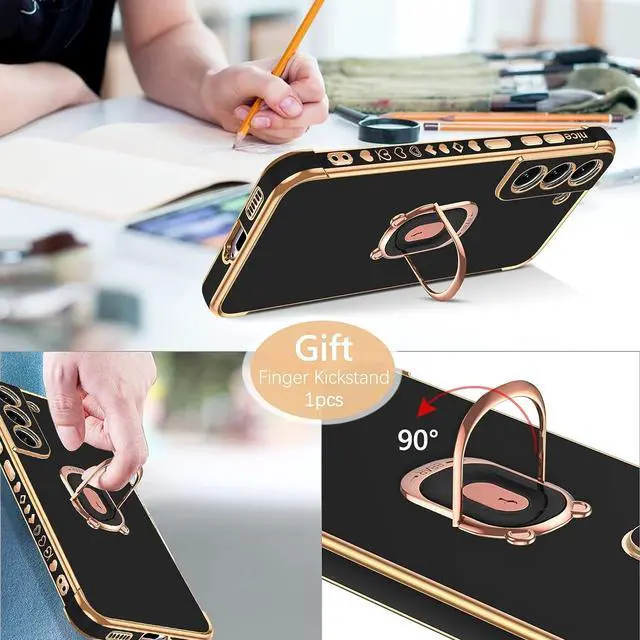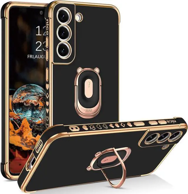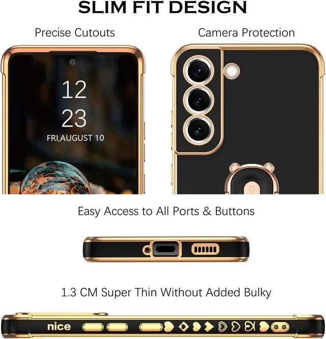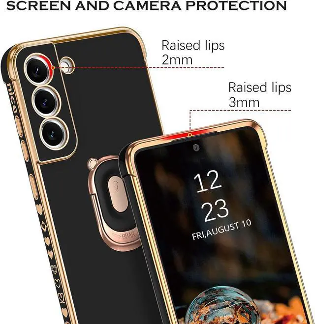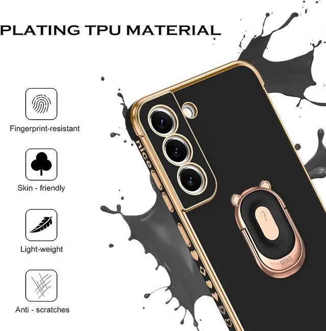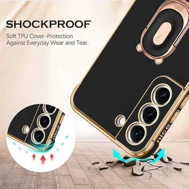 Soft and High-Quality Material: The Galaxy S21 FE bear cute kickstand phone holder black and gold silicone case uses a high-quality and soft silicone case, thin provides strong protection against drops, bumps and vibrations.