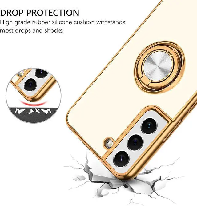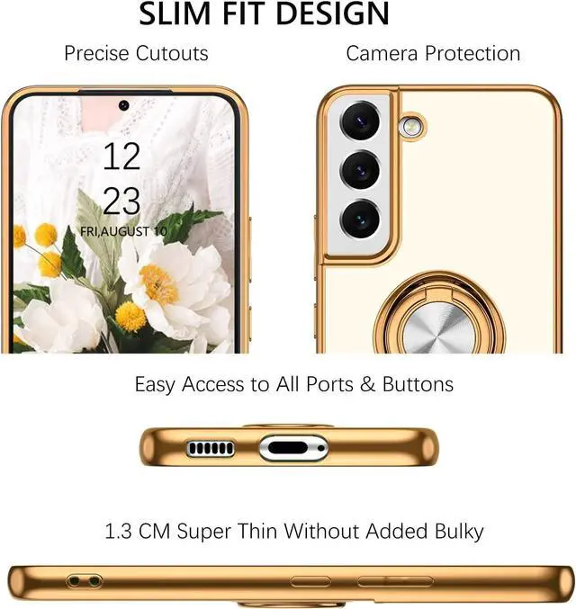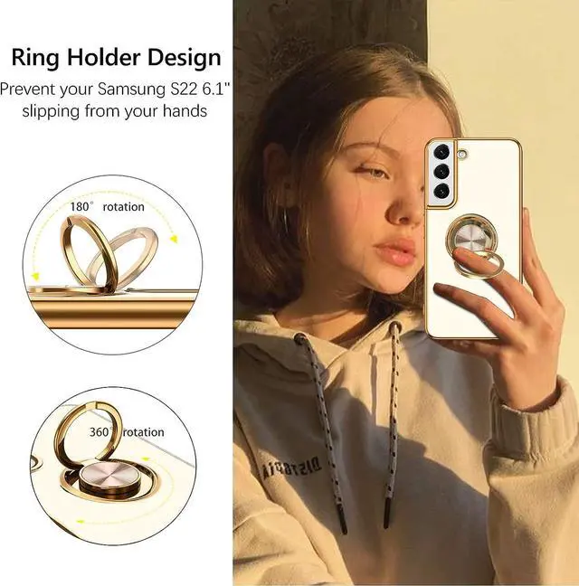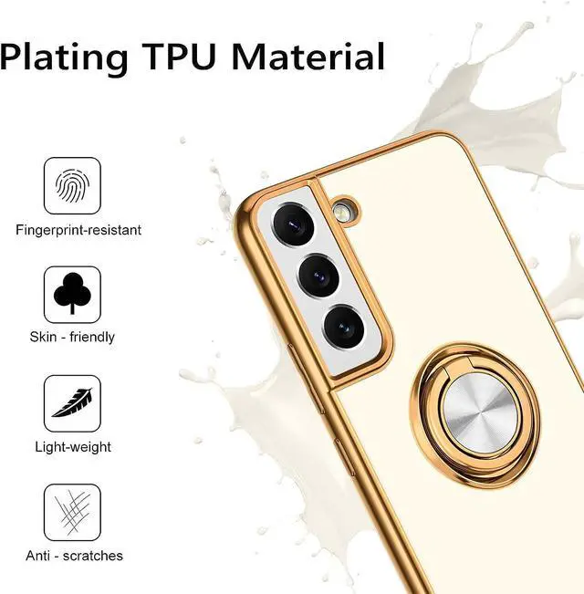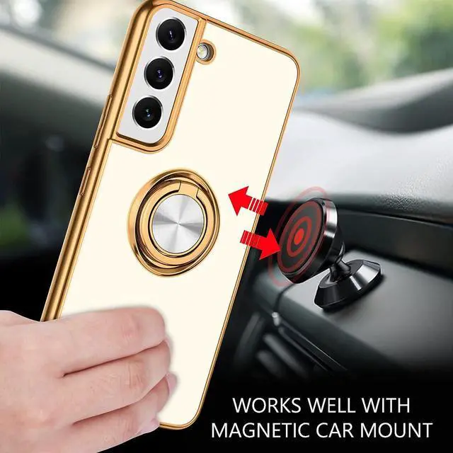 Designed for Samsung Galaxy S23 Case 6.1 Inch with 360° Rotatable Ring Holder Magnetic Kickstand Women Girls Men Slim Electroplated Gold Shockproof Protective Phone Cover 6.1", White/Gold