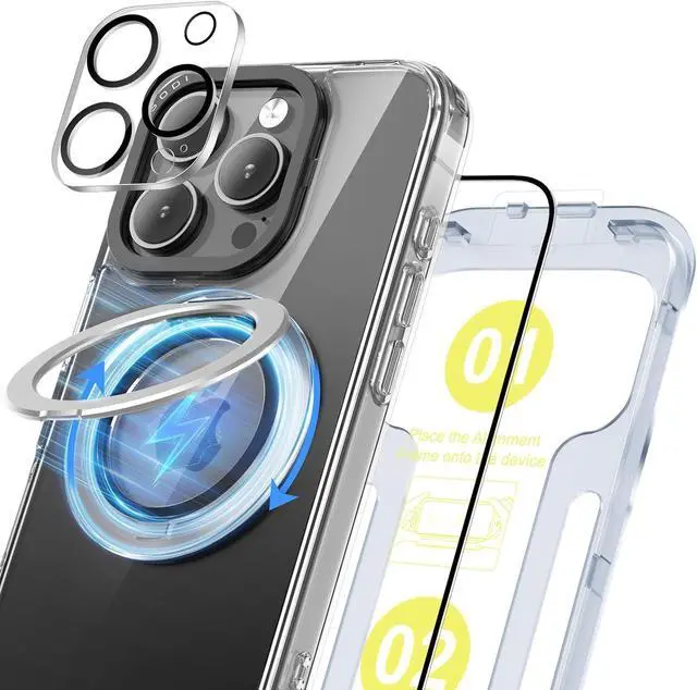 3-in-1 Magnetic Phone Case for iPhone 16 Pro with Built-in Magnetic Phone Ring Grip Kickstand Includes 1×Screen & Camera Protectors, Clear