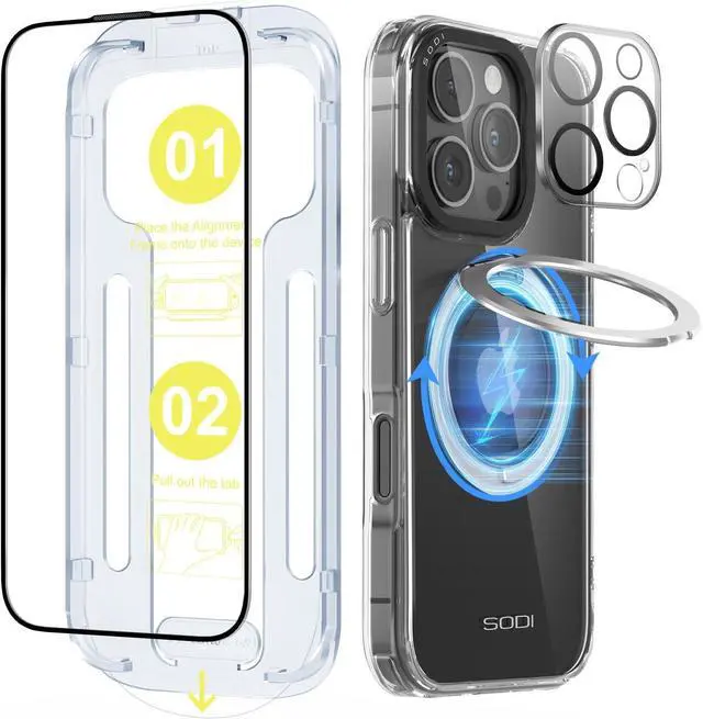 Military-Grade Magnetic Phone Ring Case for iPhone 16 Pro Max with Grip Holder, 3-in-1 Magnetic Phone Kickstand Case with Screen & Camera Protectors, Clear