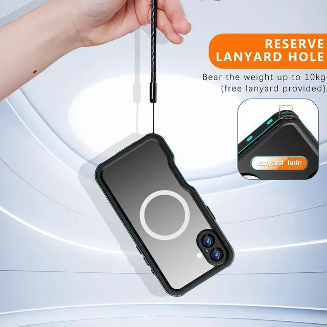 360 Full Body Protection --- The iPhone 16 Plus shockproof case has been rigorously tested to exceed Military Grade Drop Test standards. Constructed from premium TPU/PC and PET materials with a specialized double-layer frame, this case guarantees maximum durability without yellowing over time. The four anti-collision corners are designed to disperse up to 99% of impact force, effectively protecting your device from damage. Furthermore, this durable iPhone 16 Plus case includes a detachable lanyard to prevent accidental drops