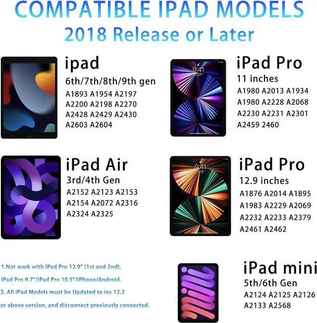Compatible with iPad Pro11/ 12.9 inch (2018-2021 Gen), iPad 9.7 inch (6th Gen), iPad 10.2 inch (7th Gen), iPad 10.2 inch (8th Gen), iPad 10.2 inch (9th Gen), iPad Air 3( 10.5", 2019), iPad Air 4( 10.9", 2020), iPad Air 5( 10.9", 2022), iPad Mini 8.3 inch (6th Gen) and iPad Mini 7.9 inch (5th Gen). Only supports Apple iPad 2018 release or later models. All IPad Models must be Updated to iOS 12.2 or above version, and disconnect previously connected.