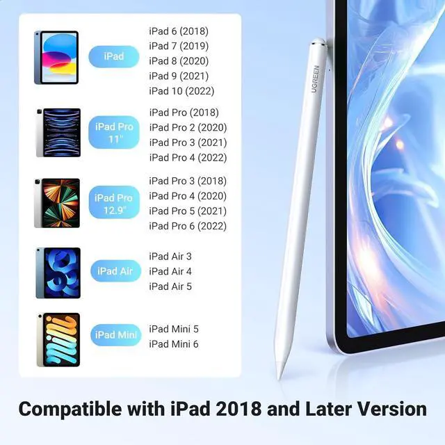Specialized for 2018-2023 iPad: Please refer to the compatibility sheet to confirm if your device is compatible before purchase! UGREEN iPad pencil ONLY works with iPad 10th, 9th, 8th, 7th, 6th generation; iPad Pro 12.9" 6th, 5th, 4th, 3rd generation; iPad Pro 11" 4th, 3rd, 2nd, 1st Gen; iPad Air 5th, 3rd, 4th Gen; iPad Mini 6th/5th Gen.