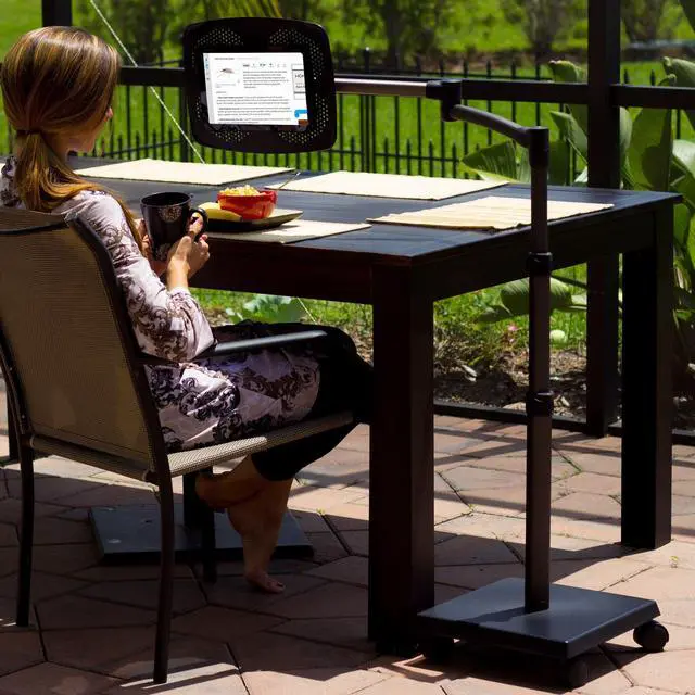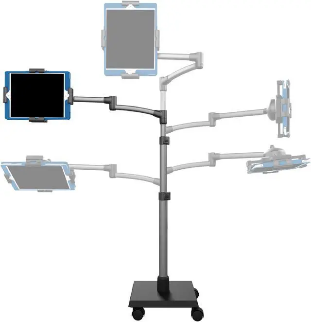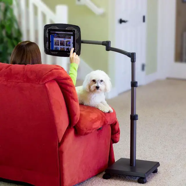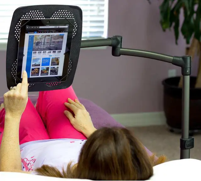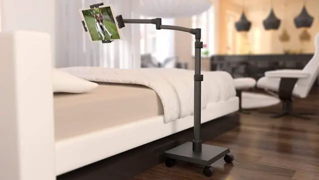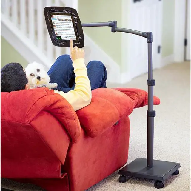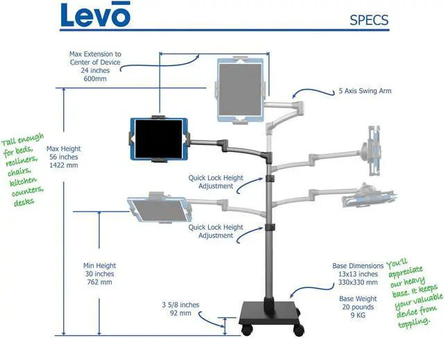 The LEVO G2 Deluxe Floor Stand for Tablets is a heavy duty adjustable iPad, tablet and eReader rolling stand which allows users to sit, lay back, or lie in bed while securely using their tablet - hands free! The sturdy build quality and solid design minimize bouncing and largely prevent tipping, ensuring hassle-free viewing comfort. A key feature of this unit is the 5-axis articulating arm which offers easy positioning and adjustable tension - allowing optimal positioning in all 3 dimensions. The user can also interchange platforms from tablets and eReaders to books - and back again with the 33701 Book Platform Kit Accessory (sold separately). The LEVO G2 Tablet Holder is ideal for users reading while working out, reading while recovering from injury or sickness, or surfing the web in bed. If the application is primarily an office setting over a desktop, a smaller footprint alternative is the LEVO Deluxe Tablet Clamp Stand.