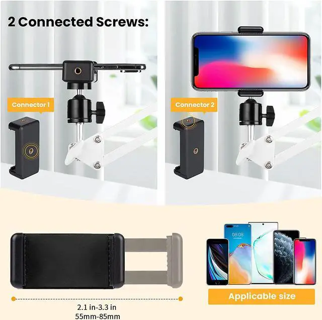 Supports Almost All Types of Phones The desk arm is built to support most phones on the market, with the phone holder capable of holding phones between 2.1 - 3.3 inches(55-85 mm) in size. You can articulate the phone any way or any comfortable angle you want without holding it the entire time, perfect and convenient for work and for home.