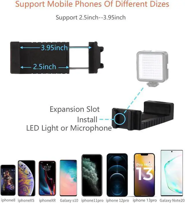 Widely compatibility: Phone video holder Compatible with 2.5 to 3.95 In devices, such as iPhone 13/12 / Pro / Mini / iPhone 11/11 Pro / 11 / XS / XS Max / XR / X / 8 / 8P / 7 / 7P / 6s / 6 Samsung S10 / S9 / S8 / Note 10 etc. Head ball with 1/4" screw also compatible with Desktop Logitech Webcam C930e, C930, C920, C922x, C922, Brio 4K, C925e, C615, camera, action cam