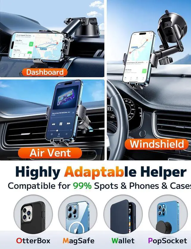 Versatile Car Phone Mount: Cell phone car mount boasts premium suction strength and an upgraded air vent clip allowing for flexible installation options on windshields dashboards and air vents.